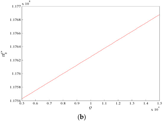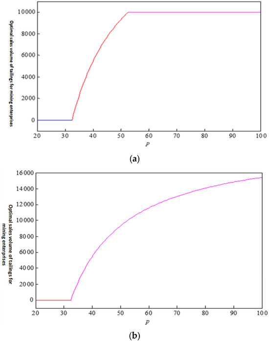 According to the total number of tailings, the mining enterprises’ optimal sales volume of tailings conforms to the combination of 4-2-1 or 4-3 with the changing trend of tailings sales price. The following uses numerical examples to simulate the two combinations, and the relevant parameters are set as follows: , , , , , , , , , , gain: , , ) = 19,179. First of all, for hypothesis , plot the trend of the optimal sales volume of tailings in mining enterprises with the sales price of tailings, as shown in Figure 2a. Secondly, for hypothesis , plot the trend of the optimal sales volume of tailings in mining enterprises with the sales price of tailings, as shown in Figure 2b.