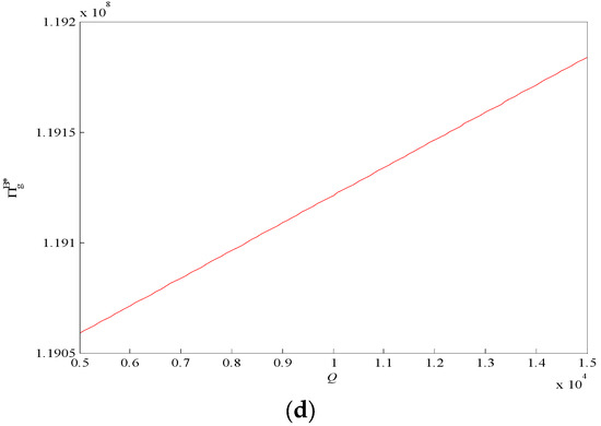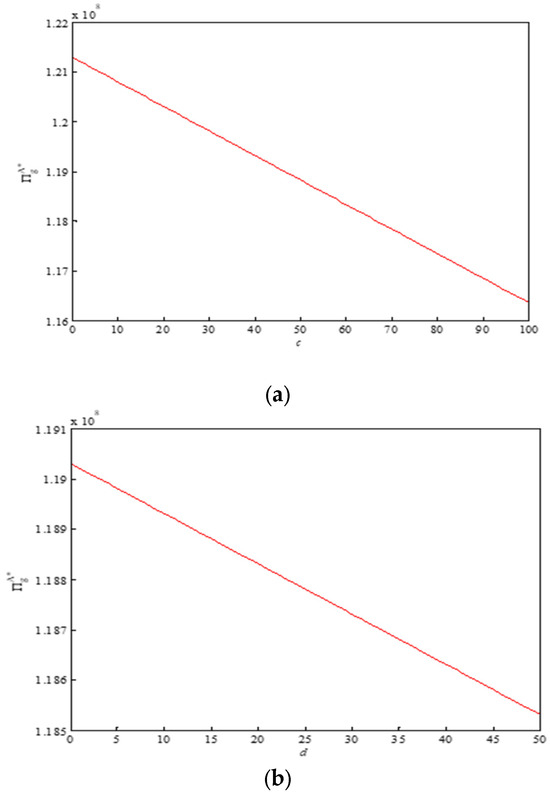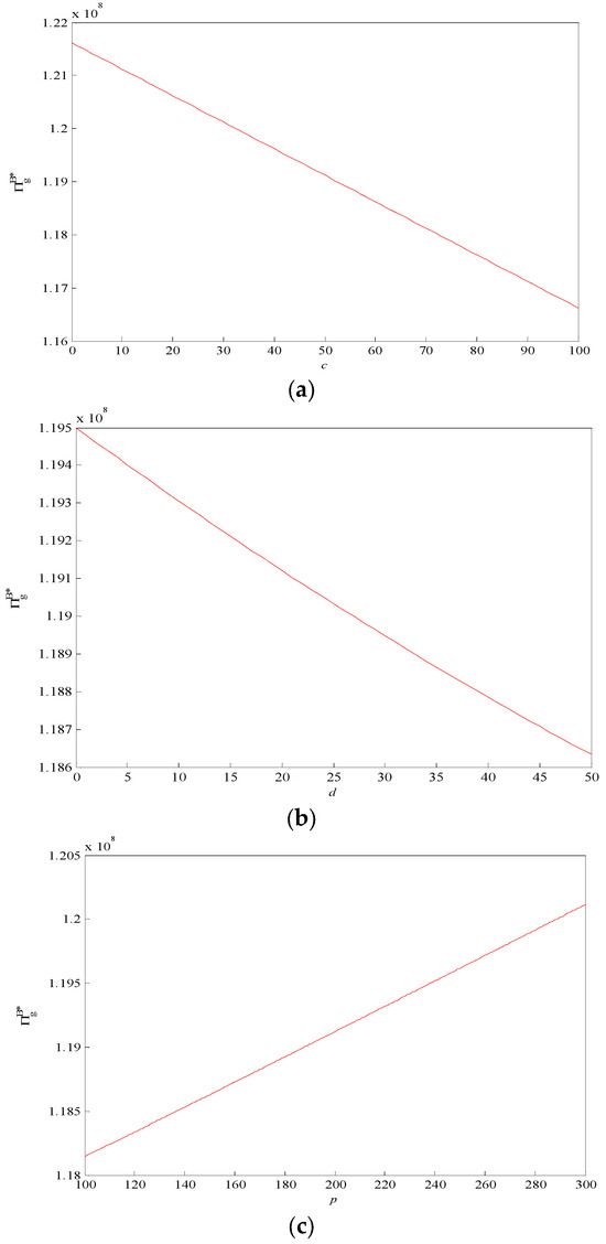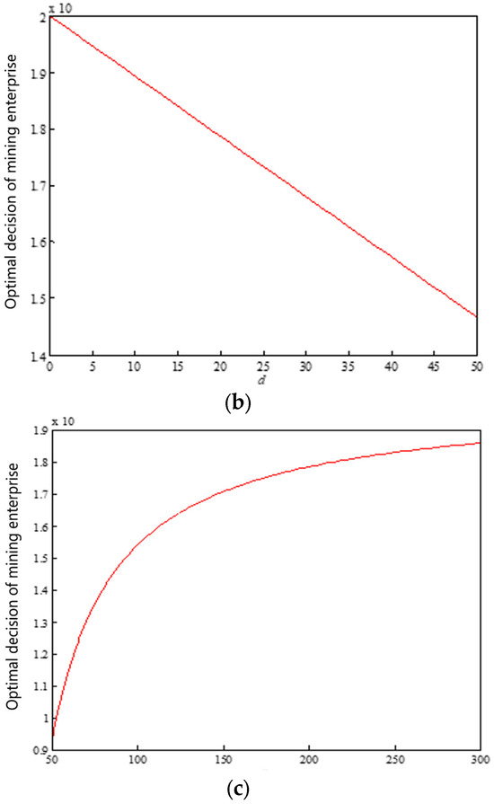 The enterprise’s optimal sales volume of tailings with , , and (mode II): (a) correlation between the optimal sales volume of enterprise tail sand and c; (b) correlation between the optimal sales volume of enterprise tail sand and d; (c) the correlation between the optimal sales volume of enterprise tail sand p.