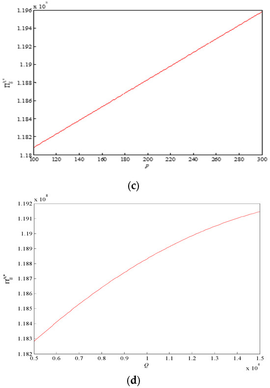 The change trend of expected income of mining enterprise with , , , and (mode II): (a) correlation between expected return of mining enterprises and c; (b) correlation between expected return of mining enterprises and d; (c) correlation between expected return of mining enterprises and p; (d) correlation between expected return of mining enterprises and Q.
