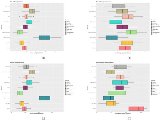 Supplementary Material (Tables S2–S4). Additionally, a comparison between rice productivity and other crop data, encompassing cultivated area (ha), harvested area (ha), and yield per ha (kg) for selected provinces from 1981–2021 is illustrated in