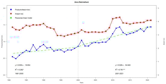 Figure 5b shows highlights for three separate slopes in the rice yield (ton/ha)—one from 1981–1995, from 1996–2010, and the other from 2010–2021, all of which are on an upward trend. These patterns correspond to three regression models: