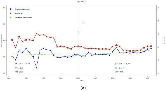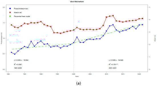 Figure 4a shows highlights on two separate slopes in the production (ton) regression line (blue line)—one from 1981–2000 and the other from 2001–2021, both of which are on an upward trend. For the area (ha), there is a declining slope from 1981–2000, which reverses into an increasing trend from 2001 onwards. These patterns correspond to two regression models: