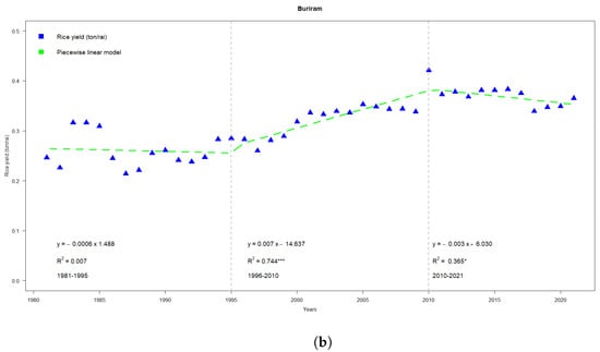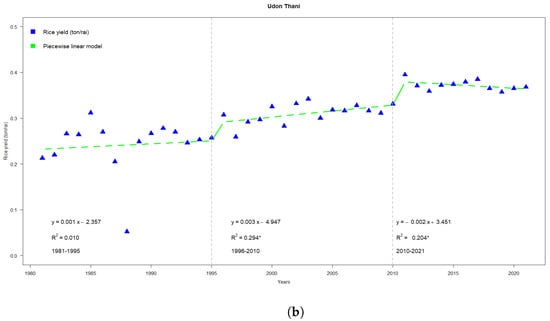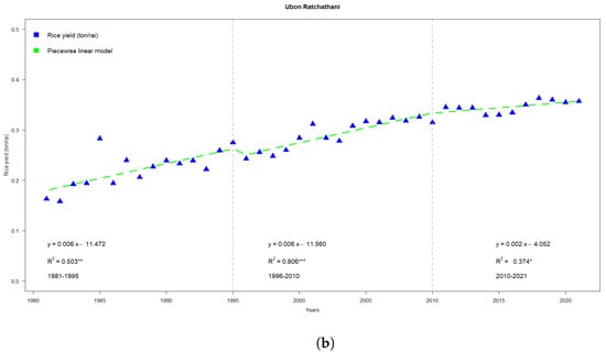 Figure 7b shows highlights for three separate slopes in the rice yield (ton/ha)—one from 1981–1995, one from 1996–2010, and the other from 2010–2021, two of which are on an upward trend and the last one is on a downward trend. These patterns correspond to three regression models: