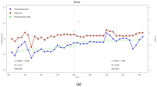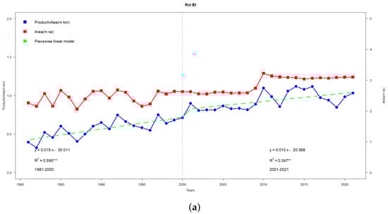 Figure 5a illustrates the production (ton) regression line (blue line) with two distinct slopes: a decreasing trend from 1981–2000 and a stable trajectory from 2001–2021. Similarly, the area (ha) showcases a downward slope from 1981–2000, transitioning to a consistent trend from 2001 and beyond. These patterns correspond to two regression models: