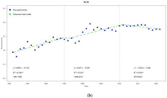 Figure 4b shows highlights for three separate slopes in the rice yield (ton/ha)—one from 1981–1995, from 1996–2010, and the other from 2010–2021, all of which are on an upward trend. These patterns correspond to three regression models: