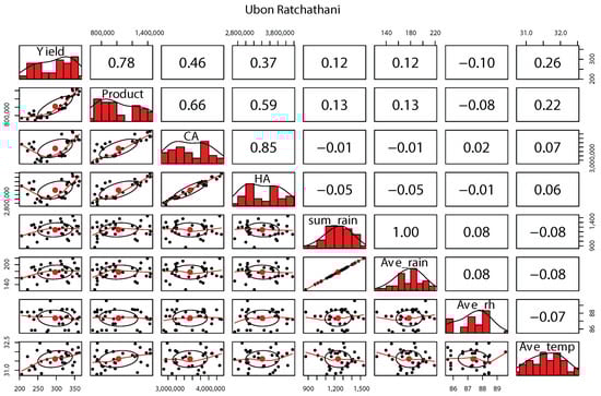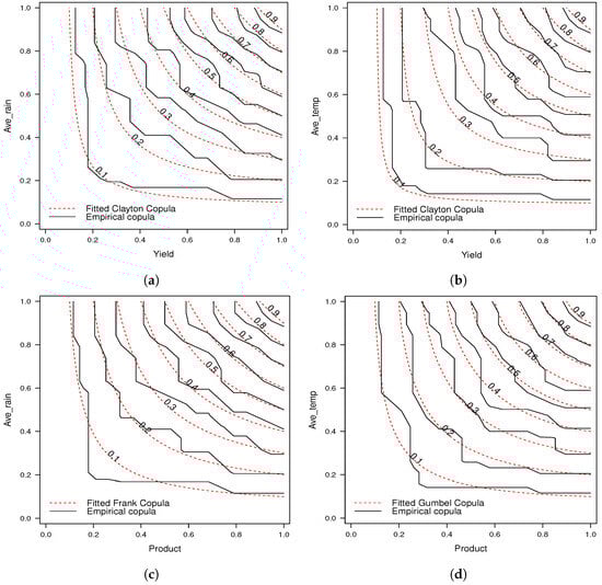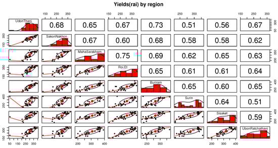 Table 9 outlines the results of the copula function relating variables in the Ubon Ratchathani province. The most fitting copula between yield and average rainfall, as well as average temperature, is the Clayton copula. For the correlation between product and average rainfall, the Frank copula is most apt, whereas the Gumbel copula best describes the relationship between product and average temperature.
