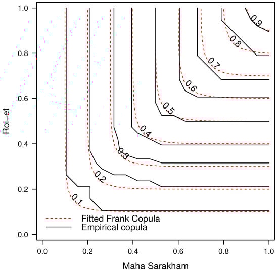 Table 7 presents the outcomes derived from the copula function that examines the product relationship between the Maha Sarakham and Roi-Et provinces. A pronounced correlation is evident, with the Frank copula emerging as the most fitting, having an estimated parameter value of 15.12 and a standard error of 3.36. For enhanced clarity,