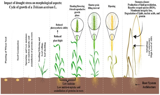 Drought stress occurs in plants with an internal water deficit due to an inadequate water supply. The condition manifests when plants are without sufficient water for an extended period. Plants’ physiology, morphology, and productivity can all be drastically altered by drought stress. One significant effect of drought stress is reducing crop yields [,]. Plants cannot carry out their critical physiological functions when deprived of water. The plant’s photosynthesis, nutritional uptake, and hormonal balance may all suffer, causing stunted growth, withering, and even death [,]. Drought stress also interferes with many plant processes. Many biological activities, such as cellular respiration, which produces energy, require water. These mechanisms, metabolic activity, and plant health, in general, suffer when water is scarce [,,]. Stomatal apertures, which regulate the exchange of gases and water vapor between the plant and the environment, are similarly affected by drought stress. Increased transpiration can worsen water shortages caused by this interruption [,].