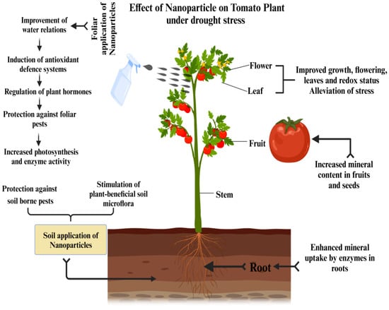 Consequently, plants exhibit improved growth, development, and survival even under water-limited supply. The exact mechanisms behind the NPs-induced activation of antioxidant defense systems require further investigation. Nevertheless, the findings indicate promising prospects for developing sustainable strategies to enhance plant drought tolerance []. Further research and exploration in this field will likely provide novel insights and practical applications for sustainable crop production and environmental conservation [,].