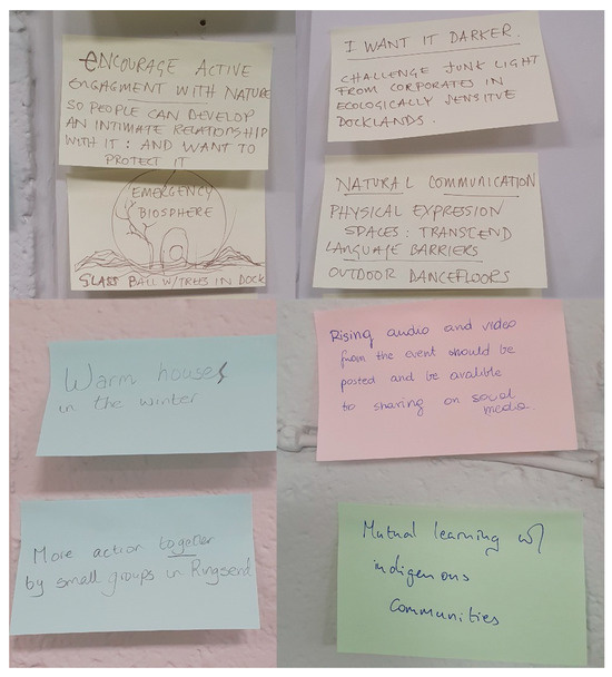 Boda [37] calls attention to the variable and ambiguous use of the word “community” in sustainability research and presents a useful heuristic for defining community within any given study under the headings of 1. Ontology and Epistemology; 2. Methodology; and 3. Motivation. Based on this heuristic, our study relates to a community of interest with an ontological status defined by shared commitments to positive, local climate action. The group is conceptualised by self-identified members, and our study uncovers the motivation of the group to examine potentially conflicting or synergistic viewpoints in relation to sustainability, mediated by artistic processes.