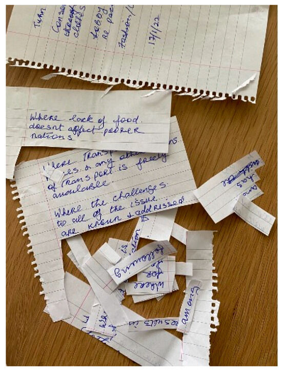 The series began with an initial workshop in November 2021 that was repeated on three occasions, in each case opening with the audio production. Many of the attendees at these sessions were visibly moved at the conclusion of the audio piece, with one participant remarking that it should be shared on social media with every young person in the area to encourage climate action (Figure 1d). The subsequent workshops were held over two hours every Monday evening for three months. These were held primarily in person, with a small number held online due to the re-emergence of COVID-19 restrictions in early 2022. The general format for these sessions was a combination of creative exercises facilitated by the artists, as well as a contribution from a guest speaker, either as a lecture or an interactive workshop. The community manager and the artists worked to identify and arrange guest speakers. These were generally individuals active in areas related to climate change, biodiversity, environmental protection and sustainability, including university staff members or representatives of local organisations. The approach to programme development was fluid and shaped in response to participant interests. Speakers were generally not determined until a few weeks in advance of the workshops. Participants were informed early on in the process that the end goal of the project was twofold—for them to undertake some local climate action as well as some sort of creative output in April 2022; however, the format for this final output was not settled by the artists until a few weeks before the end of the project. The creative elements of the weekly workshops facilitated by the artists were varied and included individual reflections (Figure 1), group dialogue and creative writing (Figure 2), as well as embodied arts practices including walks and exercises drawn from improv theatre.