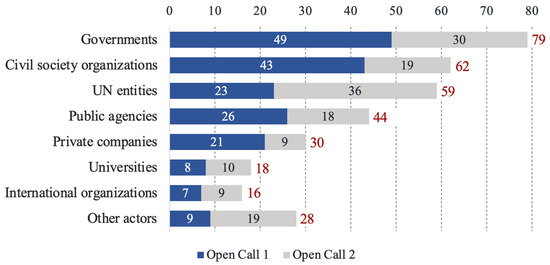 The distribution of submissions across scales of government was relatively even. National and sub-national authorities submitted 27 good practices each, and municipalities submitted 25. However, during the second open call, national and subnational responses fell by more than half compared to the first open call, while responses from municipalities increased slightly (14 compared to 11). A potential explanation is that, at the beginning of this period, national and sub-national authorities sought to establish a general framework for SDG implementation within national agendas and strategies, while once this framework was established, municipalities were encouraged to take more specific action [8,43].