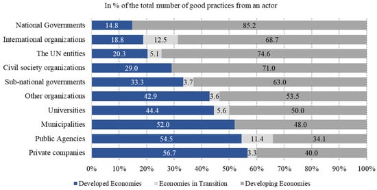 The contribution of actors varied by country according to their types of economies (Figure 3). Although the contribution of municipalities was almost equal between developed and developing countries, national and sub-national governments along with the UN entities, international institutions, and civil society organizations played a more active role in addressing SDG 11 in developing countries. This is to be expected given that the missions of these organizations are often to support developing nations. On the other hand, private companies and public agencies played an active role in the good practices of developed countries [11,12,14,15].
