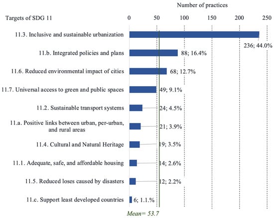 - Progress toward SDG 11 targets: whether the good practice addressed any of the ten SDG 11 specific targets, for example, 11.1—Affordable housing, 11.2—Sustainable transport system, and 11.7—Access to green and public spaces. Since very few practices directly stated which targets of SDG 11 they addressed, we identified targets based on our analysis of the content, objectives, implementation activities, and results of individual submissions. Many practices addressed more than one target.