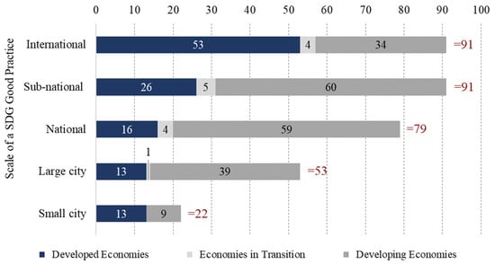The distribution of good practices by the scale of coverage and types of economies demonstrated that developing countries mainly submitted good practices at regional and national levels and large cities. Developed countries realized good practices at an international scale, and they addressed a small number of good practices at large and small city levels (Figure 5).