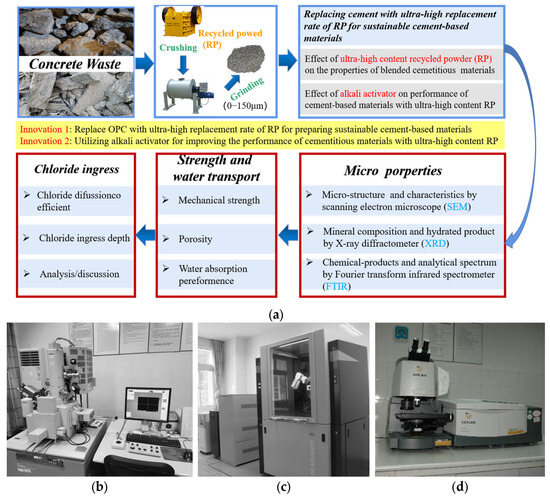 The experimental process is shown in Figure 1a. By collecting and crushing concrete construction waste, the generated construction waste powder was ground into RP, and RP (≤150 μm) was used to replace OPC with an ultra-high substitution rate to prepare sustainable cement-based materials while an alkali activator was used to improve the performance of ultra-high-content RP cementing materials. Finally, the micro-characteristics, mechanical strength, water transport, and chloride ingress of cement-based materials were determined.