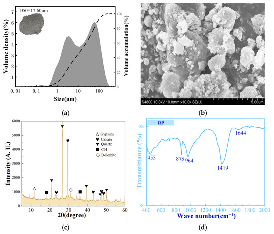 The particle size of RP is shown in Figure 2a, with a median particle size of 17.60 µm. Figure 2b shows that the recycled powder has an irregular microstructure, with larger particles often surrounded by many small particles. Moreover, SEM images show large pieces of C-S-H. Figure 2c shows the XRD mineral composition of RP. The highest content of calcite in the recycled powder is derived from the coarse aggregate in the parent material or the concrete waste hydration products in the construction waste. Additionally, a large proportion of silicon dioxide and calcite are present. It also contains large pieces of hydrated calcium silicate, some unhydrated cement particles, and high-strength inert quartz and calcite, making it difficult to participate in new hydration reactions. Figure 2d shows the infrared spectra of RP, where a significant absorption peak in the silicon–oxygen stretching vibration is observed around 970 cm−1, indicating a higher proportion of hydrated calcium silicate in RP. The maximum C-O stretching vibration absorption peak indicates a high content of calcium carbonate in RP, CH crystals, and quartz and calcite particles.