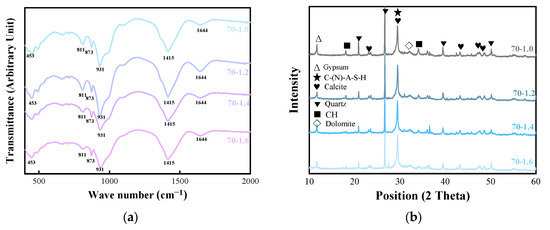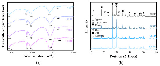 XRD pattern and FTIR spectroscopy of different RP replacement rates: (a) FTIR spectroscopy of 70–100% RP replacing cement; (b) XRD pattern of 70–100% RP replacing cement.