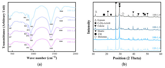 XRD pattern and FTIR spectroscopy of different RP replacement rates: (a) FTIR spectroscopy of 70% RP replacing cement with 1.0 M, 1.2 M, 1.4 M, and 1.6 M; (b) XRD pattern of 70% RP replacing cement with 1.0 M, 1.2 M, 1.4 M, and 1.6 M.