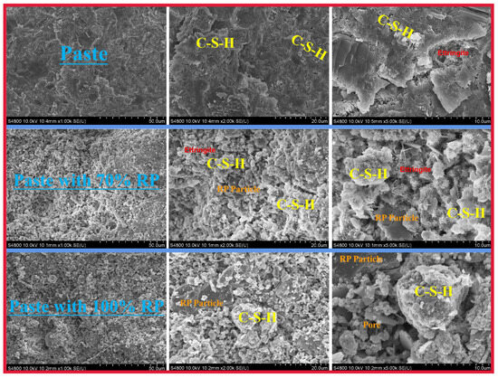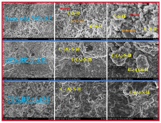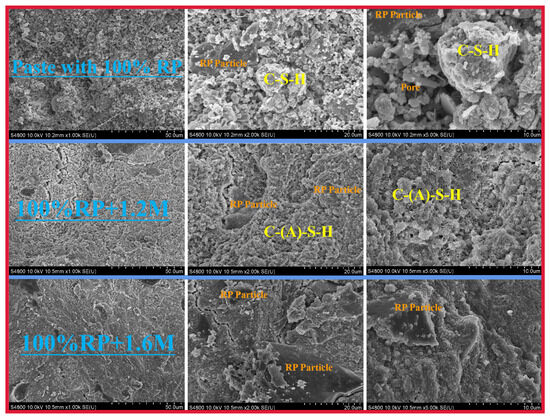 However, the cement-based material with alkali activation and 100% replacement rate has a relatively looser microstructure, as shown in Figure 8. Therefore, using a high content of RP is generally not conducive to the microstructure of the cement-based material slurry [39]. When a high amount of waste powder (100%) is added, there are a large number of particles in the alkali-activated material that are either unreacted or partially reacted, with a poor particle shape, resulting in a looser and porous microstructure. In addition, RP contains a large amount of inert quartz and calcite, which dissolve poorly under alkali activation conditions. Also, RP contains a large number of hydration products (hydrated calcium silicate) and unhydrated cement particles, which are prone to participate in new polymerization reactions under alkali activation conditions. Therefore, the microstructure of the material is relatively dense.