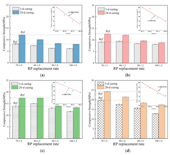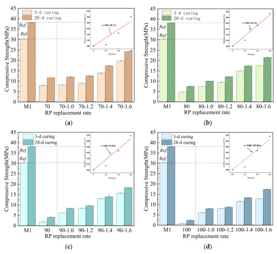 Compressive strength with different RP replacement rates: (a) 70% RP replacing cement; (b) 80% RP replacing cement; (c) 90% RP replacing cement; (d) 100% RP replacing cement.