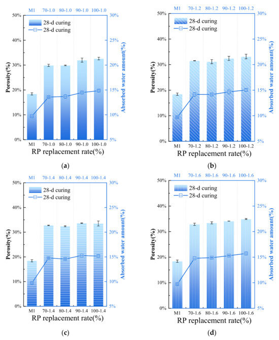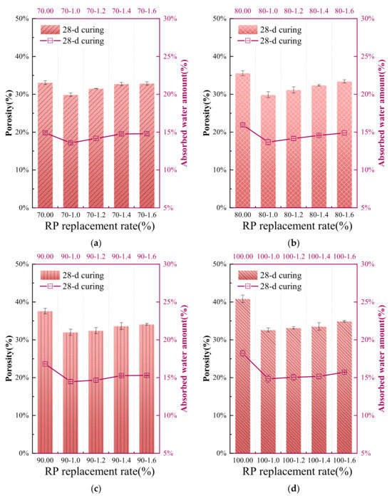 - With the increase in RP substitution rate, the mechanical strength of cement-based materials generally decreases, while the water absorption and total porosity increase significantly. The 3 d strength of CBM-70, CBM-80, CBM-90, and CBM-100 decreased by 73.63%, 84.06% and 93.65%, and 96.98%, respectively, compared with the pure cement control group. The 3 d strength of CBM-100 was only 0.89 MPa. The 28 d intensities of the control group were 30.54%, 19.82%, 10.79%, and 6.26%, respectively.