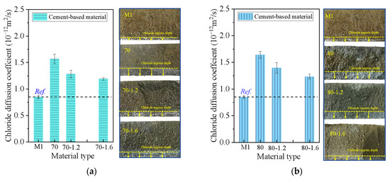 - With the increase in construction waste substitution rate, the diffusion coefficient of chloride ions increases, and the immersion depth of chloride ions increases. CBM-70, CBM-80, CBM-90, and CBM-100 were, respectively, 71.9%, 79.3%, 121.3%, and 136.5% higher than the cement reference group. After alkali excitation, the diffusion coefficient and penetration depth of chloride ions of cement-based materials are reduced, and the chloride ion penetration can be further reduced by increasing the modulus of water glass. CBM-100-1.2 and CBM-100-1.6 were 25.9% and 35.1% lower than CBM-100.