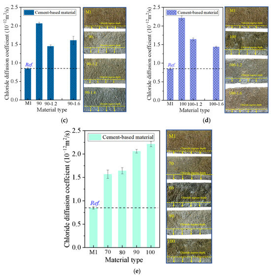 As shown in Figure 13e, the chloride diffusion coefficient of the mixture increased with the increase in RP replacement rate. For example, CBM-70, CBM-80, CBM-90, and CBM-100 increased by 84.6%, 93.4%, 142.8%, and 160.7%, respectively, compared with the cement control group. However, the addition of alkali activators can reduce chloride diffusion. Compared with CBM without alkali activation, CBM-70-1.2, CBM-80-1.2, CBM-90-1.2, and CBM-100-1.2 reduced the penetration by 18.3%, 14.9%, 29.8%, and 25.9%, respectively. In addition, Figure 13a–d show the chloride diffusion depth of cement-based materials after alkali activation. With the increase in the sodium silicate modulus, the chloride intrusion depth decreased. The addition of alkali-activated C-(N)-S-H refined the pore structure of cement-based material due to its high alkali activation activity. Under the condition of an RP replacement rate of 70%, CBM-70-1.2 and CBM-70-1.6 reduced the chloride penetration depth by 18.3% and 24.1%, respectively, compared with the cement control group with an RP replacement rate of 70%. When the replacement rate reached 100%, CBM-100-1.2 and CBM-100-1.6 reduced the penetration depth by 25.9% and 35.1%, respectively, compared with CBM-100 without alkali activation.
