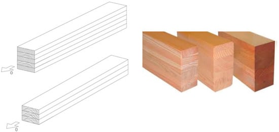 Wood, together with stone, is the oldest building material, and has been long and widely used due to its specific technical properties, availability in nature, renewability, and ease of processing and handling. Following industrialization, in some countries the use of wood has been downgraded or abandoned in favor of materials such as steel and reinforced concrete, but the notable technological evolution that has affected the wood engineering sector has determined the revamping of wood as a structural material in recent decades. From the point of view of environmental sustainability, the natural renewability of the raw material, the ability to extract carbon dioxide from the environment and store it for the entire service life of the material, even when it is transformed into a secondary and final product through manufacturing processes, and the recyclability, biodegradability, and the absence of toxic contents [7] represent advantages that allow timber to minimize its environmental impact. From the point of view of economic sustainability, timber is a light material, installed with dry connections and on small foundations, and easily prefabricated. These properties benefit timing, assembly, and logistics, and determine the general reduction of construction costs. From a performance point of view, timber can be used as a structural material, without reinforcing materials, in compressed elements such as pillars, bent elements such as beams, and stretched elements such as tie rods, unlike what happens with concrete and masonry. This is due to timber’s appreciable mechanical strength both in compression and in tension, which makes it an excellent competitor even for modern steel or reinforced concrete structures. Timber is also characterized by natural hygroscopicity, high thermal inertia, and low conductivity, therefore contributing to environmental comfort [8,9]. Owing to these positive issues, the wood industry is constantly expanding in Europe. In Italy, the timber construction sector is growing, and today, the turnover of the timber construction industry exceeds 1 billion euros, marking +33% compared to 2020, and Italy is currently the third European manufacturer of prefabricated timber buildings [10]. The spread of timber in the construction sector is favored by the production and development of laminated timber, an engineered wood that combines the characteristics of industrial products subject to quality control, such as high and constant performance and reliability, with the intrinsic advantages of a natural material. The main structural product in laminated timber is the GLT (Glue-Laminated Timber) beam, composed of overlapping boards glued in the direction of the grain (Figure 1).