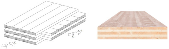 To produce GLT, boards cut from fresh logs and then artificially dried are used, selected according to the proper mechanical strength grading. The boards undergo an initial check that identifies their defects (knots, clusters of knots, resin pockets, grain deviation, deformations) and, in the event of exceeding the threshold values defined by the standards, the defective part is eliminated by truncation. The boards reclaimed from defects undergo a finger jointing and then pass to planing, and finally, to gluing. This production process ensures that the final product has superior mechanical characteristics compared to the parental solid wood. A further evolution of laminated timber technology is Cross-Laminated Timber (CLT), manufactured by superimposing layers of boards orthogonal to each other (Figure 2). The typical effects of wood anisotropy are attenuated by the cross-layer configuration, which also allows the use of CLT as a load-bearing element both in vertical structures such as walls and in horizontal ones such as floors and roofs. The benefits brought by the cross-layer configuration to the mechanical characteristics of the CLT also allow the use of wood species with poor mechanical properties. This has a positive impact in terms of sustainability, as it favors the use of local wood species that have mechanical characteristics lesser than those of Central Europe species traditionally used in the production of laminated timber [11,12]. CLT is very suitable for prefabrication, as it allows most elements to be produced in the factory and essentially only the connections to be left to construction site operations.