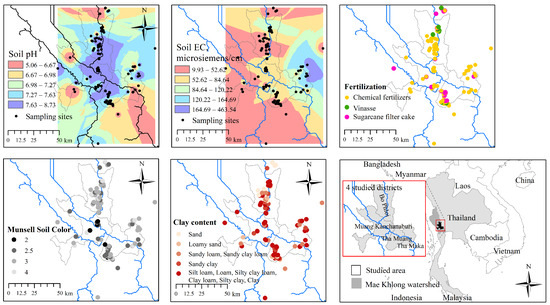 The pH levels of most soils in the studied area were slightly basic (pH 7.27–8.73), but those in Tha Maka were slightly acidic (pH 5.06–6.98). Higher soil ECs were found along the Mae Khlong River in Muang Kanchanaburi, Tha Muang, and Tha Maka, with dominant clay content and darker color soils (Figure 2). Conformingly with typical high EC soil found in the other studies [43], the high EC soil in this study was found to have dominant clay content and darker color soils (as shown in Figure 2), implying organic-rich soils. Interestingly, heavy metals content in the soils around the Khwae Noi River connecting to the Mae Khlong River in Muang Kanchanaburi were significantly high for all metal types (Figure 3). In contrast, soil samples collected from nearby areas in Tha Muang exhibited lower metal contents (except for Cr and Hg).