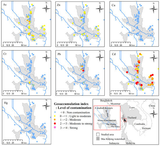 As interpreted from the geoaccumulation index (Igeo) in Figure 4, accumulations of heavy metals in the agricultural soils were significant for Cd (median of 1.35), As (0.04), and Zn (−0.69), which scatter across the studied site. Two areas are exhibiting significant accumulations of heavy metals. Most notably, Bo Phloi exhibited strong Cd contamination, moderate-to-strong Pb contamination, and moderate As and Zn contamination. The confluence of the Khwae Noi River to the Mae Khlong River at Muang Kanchanaburi also contained strong contamination of Cd and moderate levels of As, Cr, and Zn.