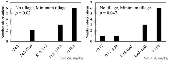 Frequency of the observations with no-tillage or minimum tillage for different soil Zn and Cd contents.
