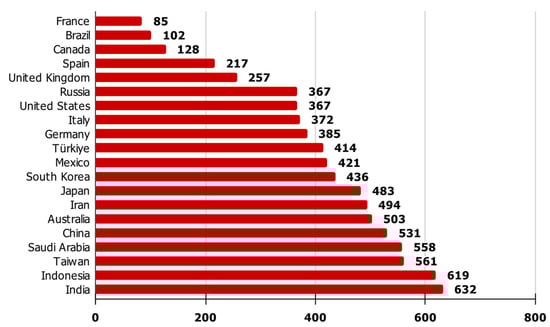 Fossil fuels still dominate global electricity production, accounting for 61% of the total. The impressive expansion of low-carbon wind and solar energy has resulted in a reduction in the usage of fossil energy. Currently, the overall contribution of wind and solar energy to worldwide electricity generation has exceeded 12%. This is more than twice its share since the agreement of the Paris Climate Accord in 2015 [29]. Despite this, coal still remains the largest source of electricity, responsible for 36% of global power generation and a quarter of all CO2 emissions. Clean electricity sources now generate 39% of global electricity, with hydroelectric power accounting for 15%, nuclear power for 9%, wind power for 7.6%, and solar power for 4.5% [30]. In 2022, the intensity of carbon emitted from electricity generation reached a record low of 436 gCO2/kWh [29]. Figure 1 shows the carbon intensity in gCO2/kWh for the 20 countries with the highest electricity production in 2022. Furthermore, the Climate Action Tracker reported in its 2020 targets a carbon intensity of electricity generation of 50–125 gCO2/kWh in 2030, 5–25 gCO2/kWh in 2040, and almost zero in 2050 [31].