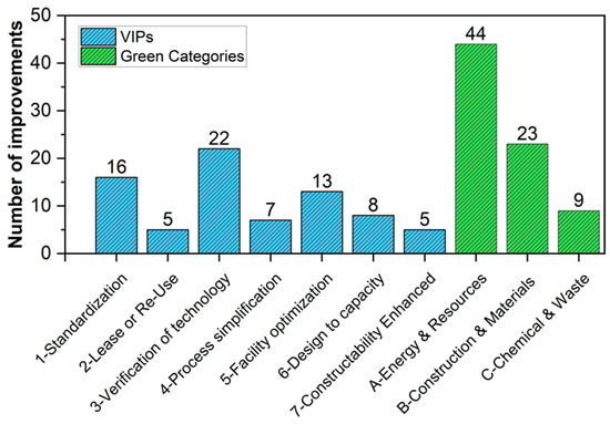 Thus, the first activity carried out during Green Value Engineering was the revision of the FEL 2 engineering document. In this case, the sessions of interdisciplinary brainstorming between the engineering team and the client’s stakeholders allowed for identifying 82 improvement opportunities (Supporting Information, File S2), which belonged to different VIPs and green categories, as presented in Figure 2.