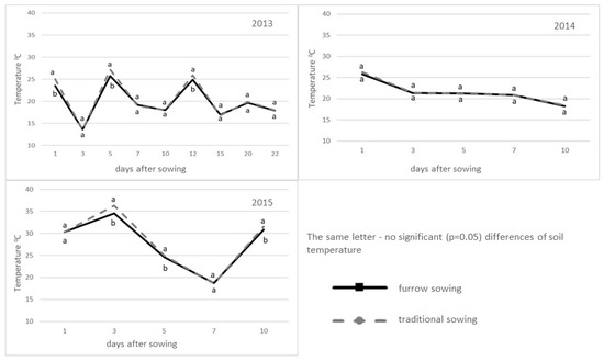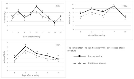 - Furrow sowing (FS)—sowing in 6–8 cm-deep farrows [24],