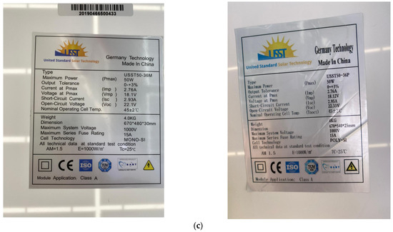 Outdoor experiments: (a) Different sensors for environmental parameters with four solar modules of different technologies. (b) Two polycrystalline PV modules of 50 W (clean and dust) and two monocrystalline PV modules of 50 W (clean and dust). (c) Specifications of monocrystalline and polycrystalline solar panels.