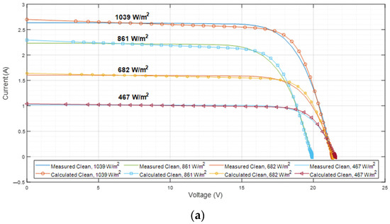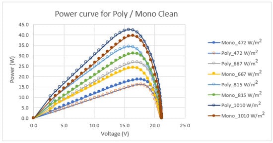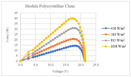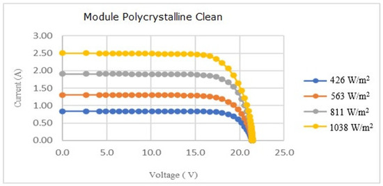Figure 5 and Figure 6 show the current–voltage characteristics and power curves of polycrystalline (Poly) modules for different incident solar irradiation, respectively. It is noted that the short-circuit current (ISC) increases with the increase in incident solar irradiation.