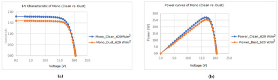 Effect of dust on I-V characteristic (a) and on power curves (b) for monocrystalline PV module at 620 W/m2.