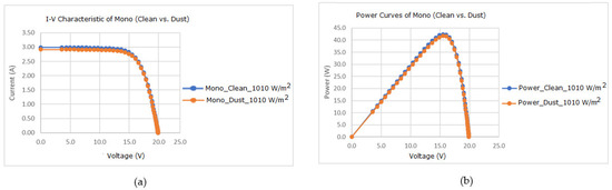 Effect of dust on I-V characteristic (a) and on power curves (b) for monocrystalline PV module at 1010 W/m2.