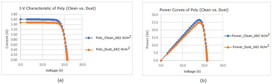 Effect of dust on I-V characteristic (a) and on power curves (b) for polycrystalline PV module at 682 W/m2.
