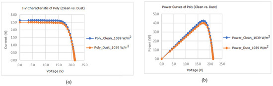 Effect of dust on I-V characteristic (a) and on power curves (b) for polycrystalline PV module at 1039 W/m2.