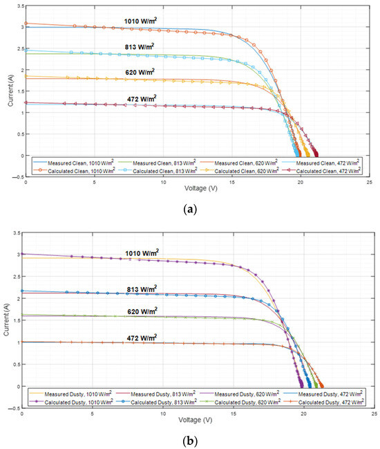 Experimental and estimated IV characteristics (Poly) for different solar radiation: (a) clean polycrystalline solar module; (b) dusty polycrystalline solar module.