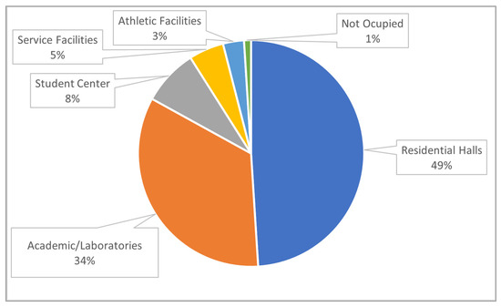 To study the power consumption pattern of the campus, the data obtained from the existing sixteen electrical meters for the year 2019 were explored. Campus buildings’ power consumption is primarily influenced by their functionality and usage type. For example, as shown in Figure 5, the campus’s power plant has a large consumption as its primary function is to provide heating and cooling (chilled water) to the main campus buildings. After the power plant, the academic and residential buildings make up for the second largest portion of the campus’s power usage as they require lighting, heating, ventilation, and air conditioning (HVAC), or plug loads. The campus’s electrical power is supplied by the power grid and an on-campus Combined Heat and Power (CHP) generator. The functionality of the buildings can be categorized as:
