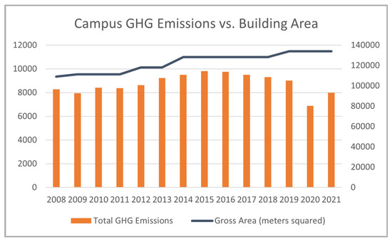 Additionally, Wentworth’s estimated carbon intensity per square foot is shown in Figure 3. The university’s carbon dioxide equivalent per meter square () has stayed almost constant with small fluctuations from calculated for the year 2013 to calculated for the year 2020. Although the university’s performance indicator is far below the city of Boston’s guidelines of for the year 2025, the university needs to improve to meet regulatory targets after 2030.
