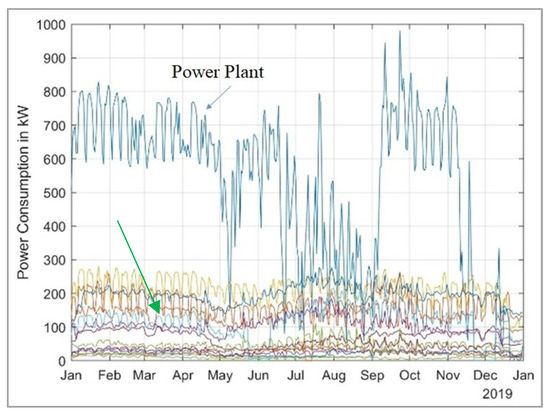 The power consumption of 16 campus buildings in the year 2019. The largest electrical power consumption belongs to a series of buildings named as the power plant. The longer green arrow indicates the group of buildings with a gross area of less than . Different colored lines are associated with the power consumption of 16 campus buildings obtained from the buildings’ meters.