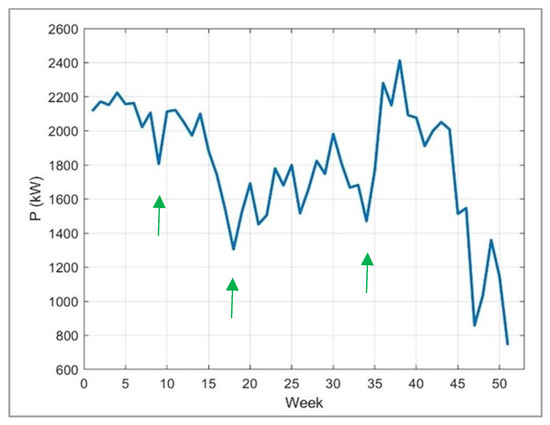 Section 3 examines the aggregated power of the academic and residential buildings. This section highlights how human activity patterns in the academic and residential buildings determine the power demand for these buildings across the university. Figure 6 shows the power consumption of the Wentworth campus from January to December 2019. The data in Figure 6 sum up the power consumption of the Wentworth power plant with all the academic buildings and residential buildings included in this study. The low valleys in Figure 6 clearly identify Wentworth breaks between and during semesters, for example, week 9 corresponds to Spring Break, week 16 the break between Spring and Summer Semesters, and week 34 the break before Fall Semester begins.