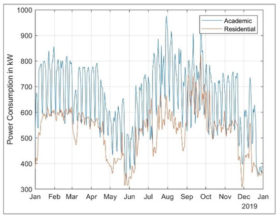 The aggregated power consumption of academic and residential buildings in the year 2019.