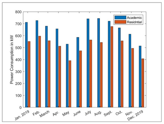 The average power consumption by month for academic buildings and residential buildings in the year 2019.