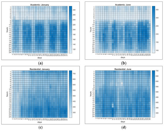 Figure 9 shows the average power consumed per hour, per day for academic and residential buildings for the months of January and June of 2019. The months of January and June were chosen as two extremes in temperature, i.e., a cold month vs. a hot month, respectively. Weekdays and weekends can be clearly identified on the maps for the academic buildings as lighter columns. Figure 9a,b show a cycle of five days of heavier power consumption followed by two days of low power consumption. Academic buildings use most of their power between 8 am (hour 8) and 8 pm (hour 20) on weekdays corresponding with the 8 am to 5 pm course and lab schedule, followed by a few evening courses and extracurricular classes or activities. The first week in January is the lightest period on the heatmap (Figure 9a) since classes began after the first week. January academic power peaked at approximately 280 kW while June peaked at 350 kW. Even though there are fewer students in June during the Summer Semester vs. January in the Spring Semester, the increase in power consumption is due to the cooling needs for the academic buildings.